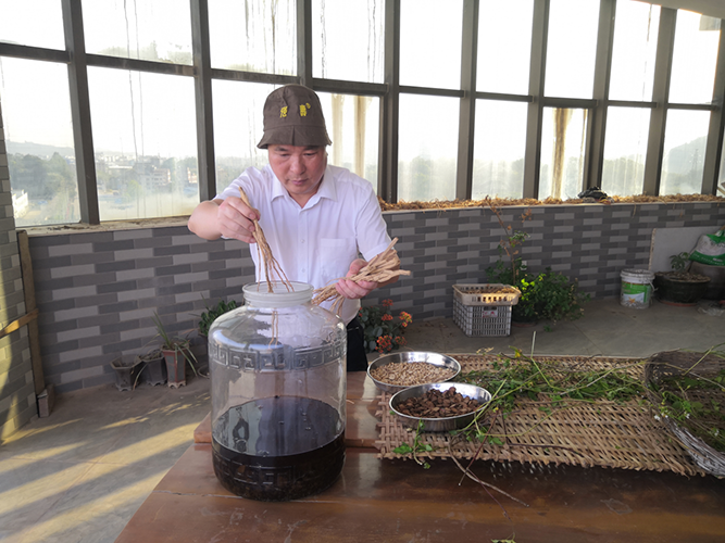 壯藥整骨水的配制是經(jīng)歷代祖?zhèn)魉幏脚c長時(shí)間行醫(yī)診治的實(shí)踐經(jīng)驗(yàn)相結(jié)合,將多種地道中草藥通過嚴(yán)格配比制備而成。壯藥整骨水的傳承人之一李燮中,男,蒼梧人,出生于岐黃世家,自小隨祖上學(xué)醫(yī),精通醫(yī)藥。為傳承民間醫(yī)術(shù),其子李燕強(qiáng)從小就跟隨在李燮中身邊從醫(yī)學(xué)藥,親歷傳授,李燮中把祖上的藥方和行醫(yī)經(jīng)驗(yàn)傳授給李燕強(qiáng),再由李燕強(qiáng)傳授給李浪輝。李燮中于1981年在蒼梧創(chuàng)立了本地第一間藥店—福樂藥店(強(qiáng)壽藥業(yè)集團(tuán)的前身),藥店為蒼梧涼茶的發(fā)展和民間傳統(tǒng)醫(yī)藥的傳承起到了承上啟下的貢獻(xiàn),造福當(dāng)?shù)匕傩铡@罾溯x從小就隨著祖父李燮中和父親李燕強(qiáng)一起從醫(yī)學(xué)藥,并樹立了要發(fā)展、壯大、振興民族醫(yī)藥產(chǎn)業(yè)的決心。李浪輝時(shí)常與家人行走在山間田野采摘草藥,并做成相應(yīng)的標(biāo)本,用于進(jìn)行各種藥物的臨床研究與探索,對傳統(tǒng)醫(yī)藥有著傳承與發(fā)展的強(qiáng)烈責(zé)任感,尤其是對民間醫(yī)藥非物質(zhì)文化遺產(chǎn)的簡、廉、便、效、捷等方面?zhèn)鞒姓莆罩?dú)特的技巧。經(jīng)過祖父、父親的傳承與創(chuàng)新發(fā)展,李浪輝掌握了多項(xiàng)民間傳承的非遺物質(zhì)文化項(xiàng)目及技術(shù)。如:蒼梧桑寄生茶、蒼梧涼茶、壯藥整骨水、整骨器具、椎墊等多項(xiàng)技術(shù)的核心制作技巧,以及獨(dú)特的制作工藝。傳統(tǒng)中醫(yī)藥是中華民族獻(xiàn)給世界人民最好的禮物,發(fā)揚(yáng)國粹,寄望傳承,將歷代的醫(yī)術(shù)傳承下去,造福人類,是岐黃世家李氏家族義不容辭的責(zé)任和使命。