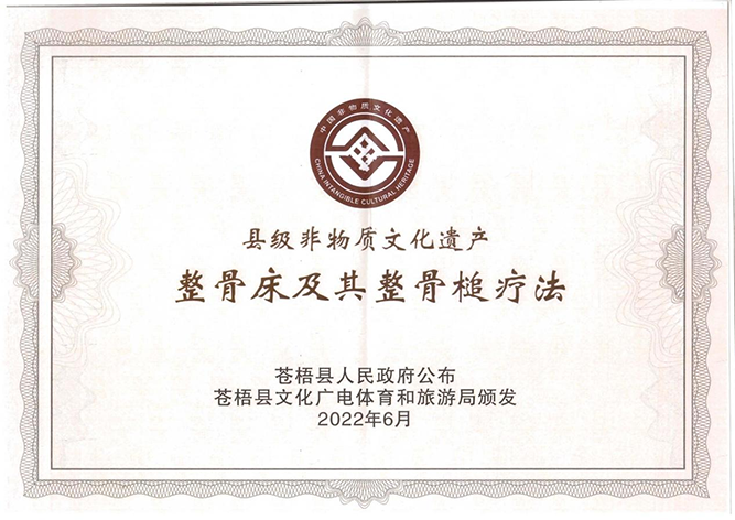 熱烈祝賀廣西強壽藥業(yè)集團有限公司整骨床及其整骨槌療法喜獲縣級非物質(zhì)文化遺產(chǎn)項目。證書由蒼梧縣人民政府公布,蒼梧縣文化廣電體育和旅游局頒發(fā)。